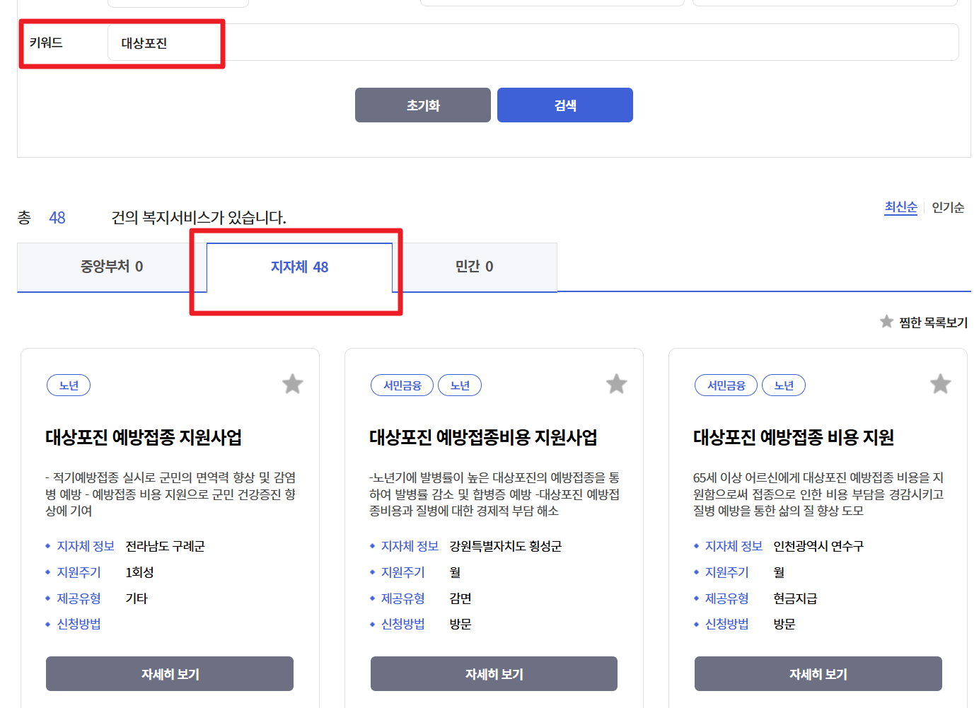 만 65세 이상의 성인이 무료접종 대상입니다. 이는 면역력이 저하되기 쉬운 연령대이기 때문입니다. 조회를 확인하기 위해서는 위 사이트를 클릭 후 대상포진 검색 한 다음 지자체를 확인하시면 됩니다.