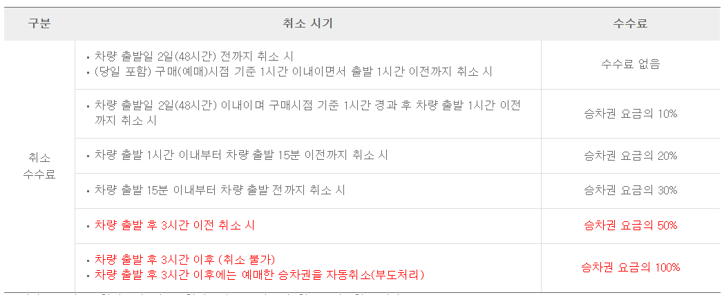 또한 당일 출발하는 차량은 10분 전까지 예매가 가능하지만 만약 취소를 원하는 경우 아래와 같이 취소 일정을 참고하셔야겠습니다.