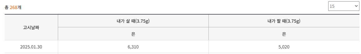 2025년 1월 31일 기준으로 3.75g의 은을 구매할 때 가격은 6,310원, 판매할 때 가격은 5,020원입니다. 이를 기준으로 계산한 결과, 1kg 은 구매 가격은 약 1,682,667원, 1kg 은 판매 가격은 약 1,338,667원입니다.
