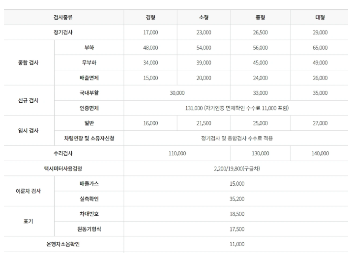 검사 비용은 차량의 종류와 검사 항목에 따라 다를 수 있으며, 정부 웹사이트나 검사소에 문의하여 정확한 정보를 확인할 수 있습니다.