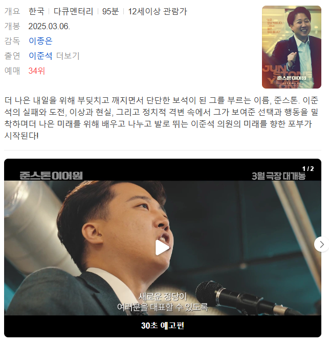 개봉일인 3월 6일에 맞춰 예매를 서둘러 원하는 시간대와 좌석에서 관람하시기 바랍니다. 이 영화를 통해 정치인의 진솔한 모습과 치열한 도전 과정을 함께 느껴보시길 바랍니다.