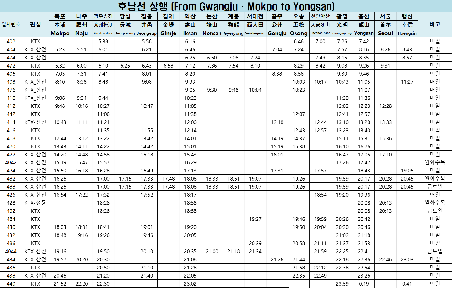하행선은 서울에서 목포로 향하는 노선입니다. 서울에서 출발해 전주, 익산, 광주송정, 목포에 도착하는 하행선 시간표는 아침부터 저녁까지 여러 차례 운행됩니다.