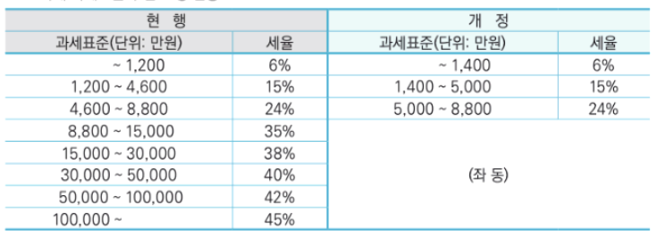 위 표에서 보듯이, 소득이 1,200만 원 이하일 경우에는 6%의 세율이 적용되었다가 이제는 1,400만원으로 적게 버는 근로자의 경우 그 부담감이 덜어졌는데요 4번째 구간부터는 지난 근로소득 세율표와 동일한 것을 확인할 수 있습니다.