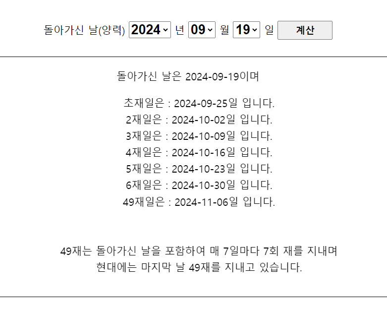 - 자동 계산: 계산기는 입력된 사망일을 기준으로 각 재의 날짜를 자동으로 계산합니다.